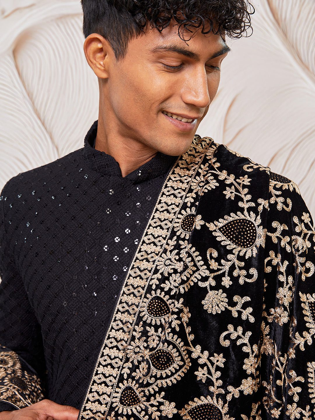 This black sequin-embroidered sherwani set is the epitome of regal sophistication and grandeur. Crafted from luxurious textured fabric adorned with subtle sequins, the sherwani brings a refined shimmer to every occasion. It is paired with a tailored straight-fit black pant for balanced elegance. The ensemble is completed with a statement-making black velvet dupatta, heavily embroidered in gold with intricate floral and paisley motifs. Perfect for weddings, festive celebrations, and evening cultural events.