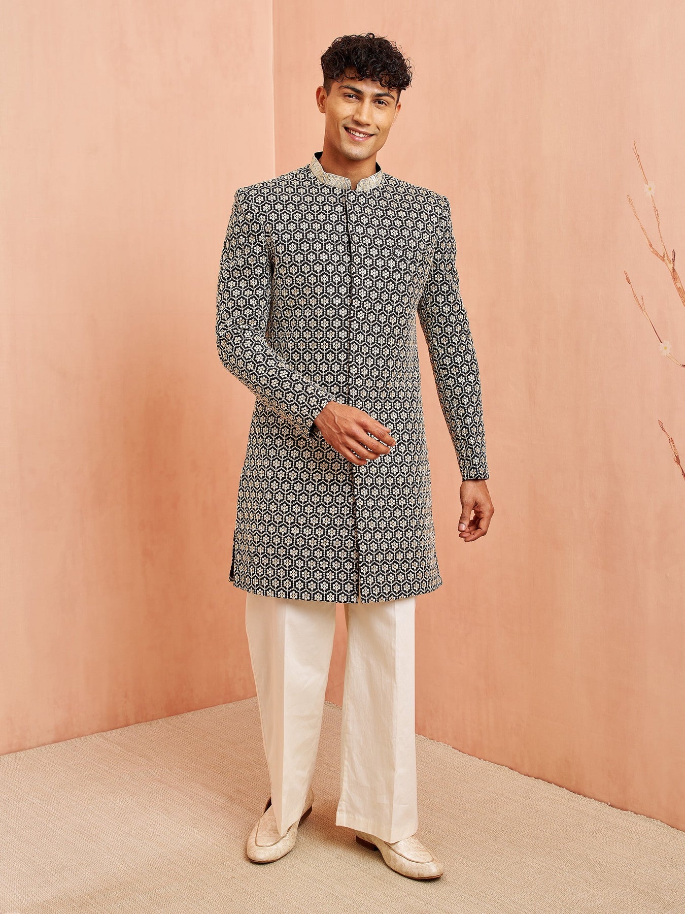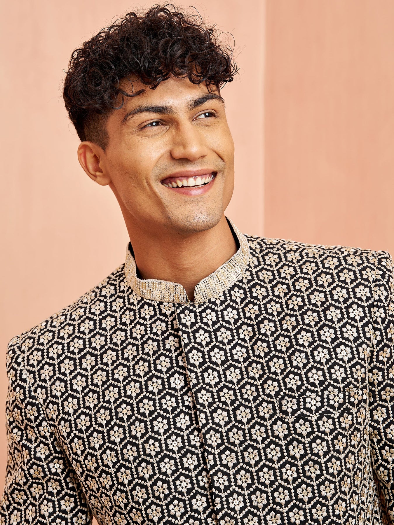 Embrace modern ethnic style with Sarvati's black indo-western set. Features hexagon sequin and thread embroidery on premium rayon fabric with polyester lining, paired with comfortable cream cotton lycra wide leg pant.