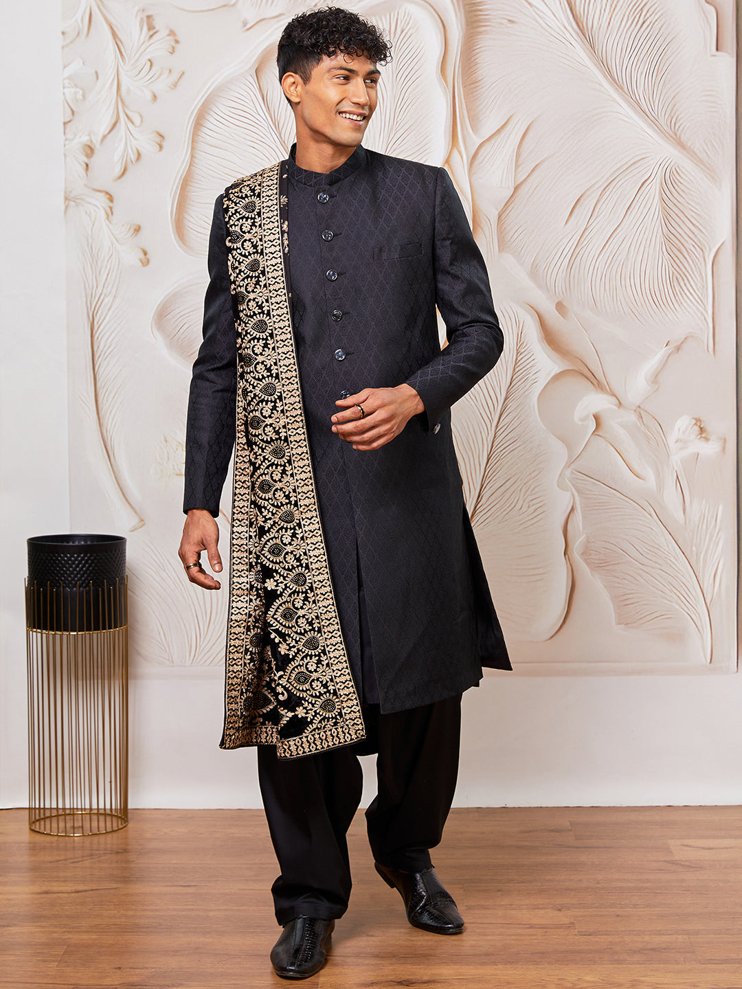 Celebrate in style with this jacquard sherwani set from Sarvati. The elegant dupatta detail makes it ideal for festive occasions. Pair it with mojaris or semi-formal shoes to complete the regal look.