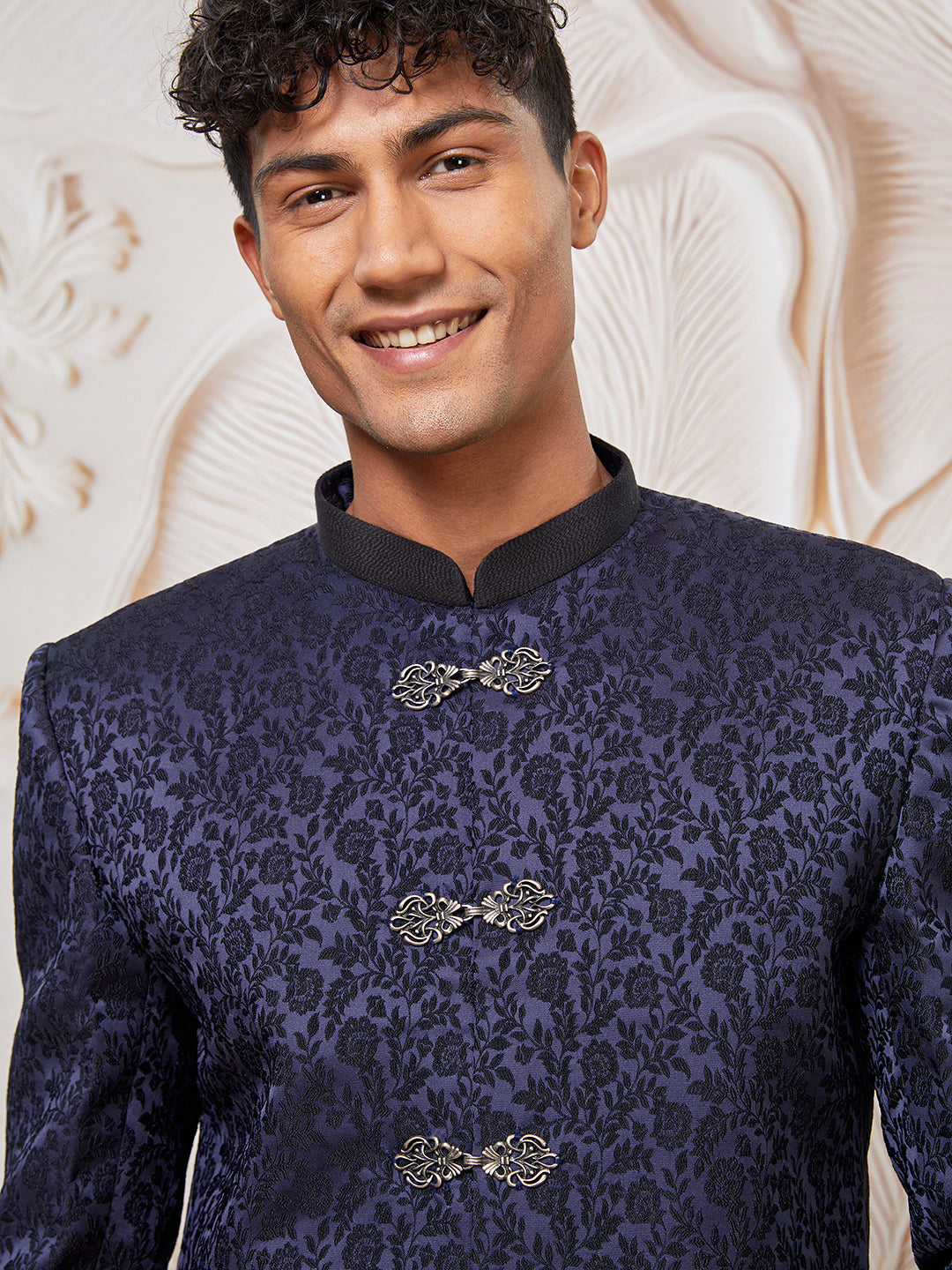 The ensemble features a sleek navy blue sherwani with intricate, subtle patterns woven throughout the fabric, lending an understated elegance. Designed in a straight, slim fit, the sherwani is fastened with ornate metallic buttons at the center, adding a regal charm to the outfit. It is paired with slim-fit pyjamas that complete the contemporary Indo-Western aesthetic.