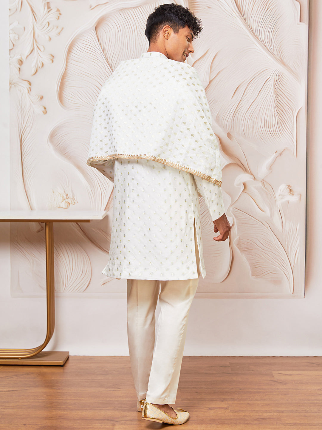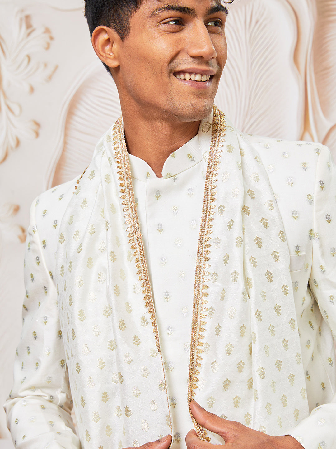 This men’s sherwani, pant, and dupatta set is a sophisticated and regal ensemble crafted for weddings and grand celebrations. The sherwani showcases intricate gold jacquard motifs that exude elegance and royal charm. Its structured silhouette enhances posture, while the mandarin collar and front button detailing add refined appeal. Paired with tailored cream-colored pants for a balanced and polished look, the set is completed with a matching jacquard dupatta, delicately bordered in gold, draping gracefully for a regal finish. Perfect for grooms, groomsmen, or anyone looking to make a striking impression.