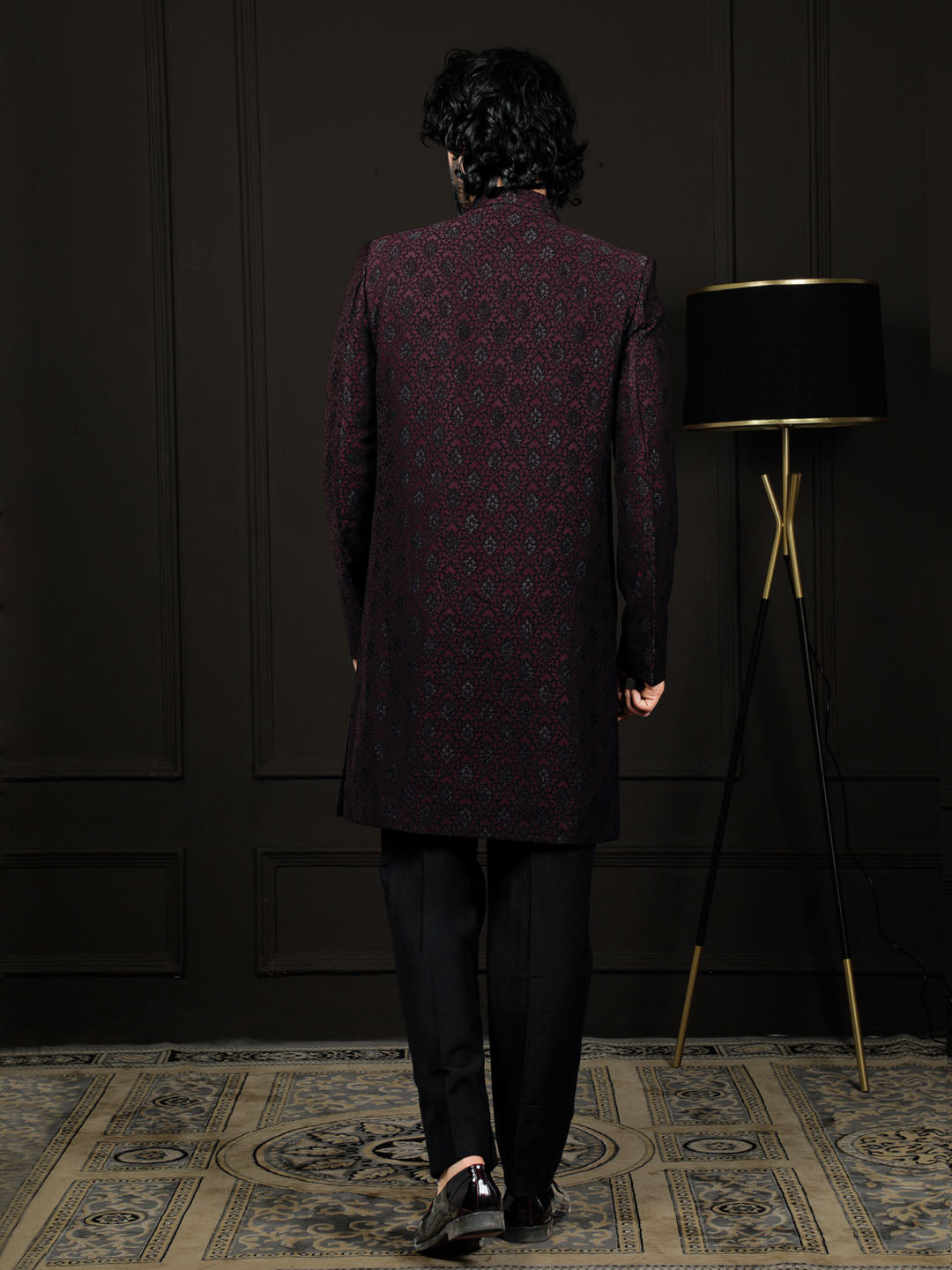 Silk blend jacquard sherwani in a knee-length regular fit. Features a mandarin collar, front-open design with invisible button placket, and full sleeves for a sleek finish. Paired with pant-style pyjama designed with a partially elasticated waistband, button closure, and side pockets for comfort. Perfect for weddings, festive occasions, and grand celebrations.