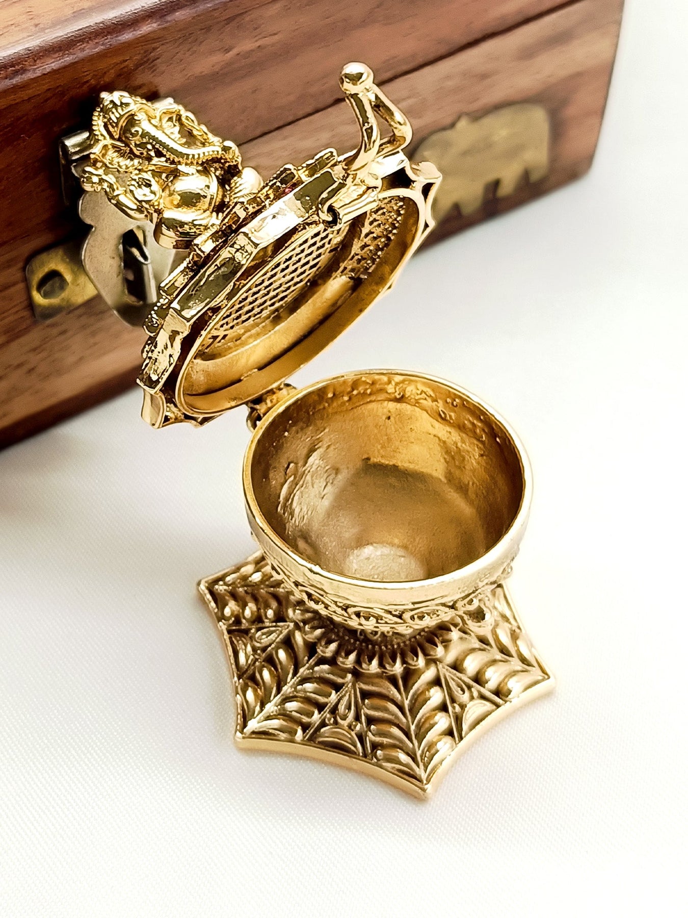 This Traditional Sindoor Dibbi Is Crafted From Gold Plated Brass Metal And Is Adorned With Intricate Temple Motifs. It Is A Must-have For Any Cultural Or Religious Occasion. Its Elegant Design Adds A Touch Of Sophistication To Any Outfit. Made With Expert Craftsmanship, It Is A Beautiful And Meaningful Piece To Add To Your Collection.