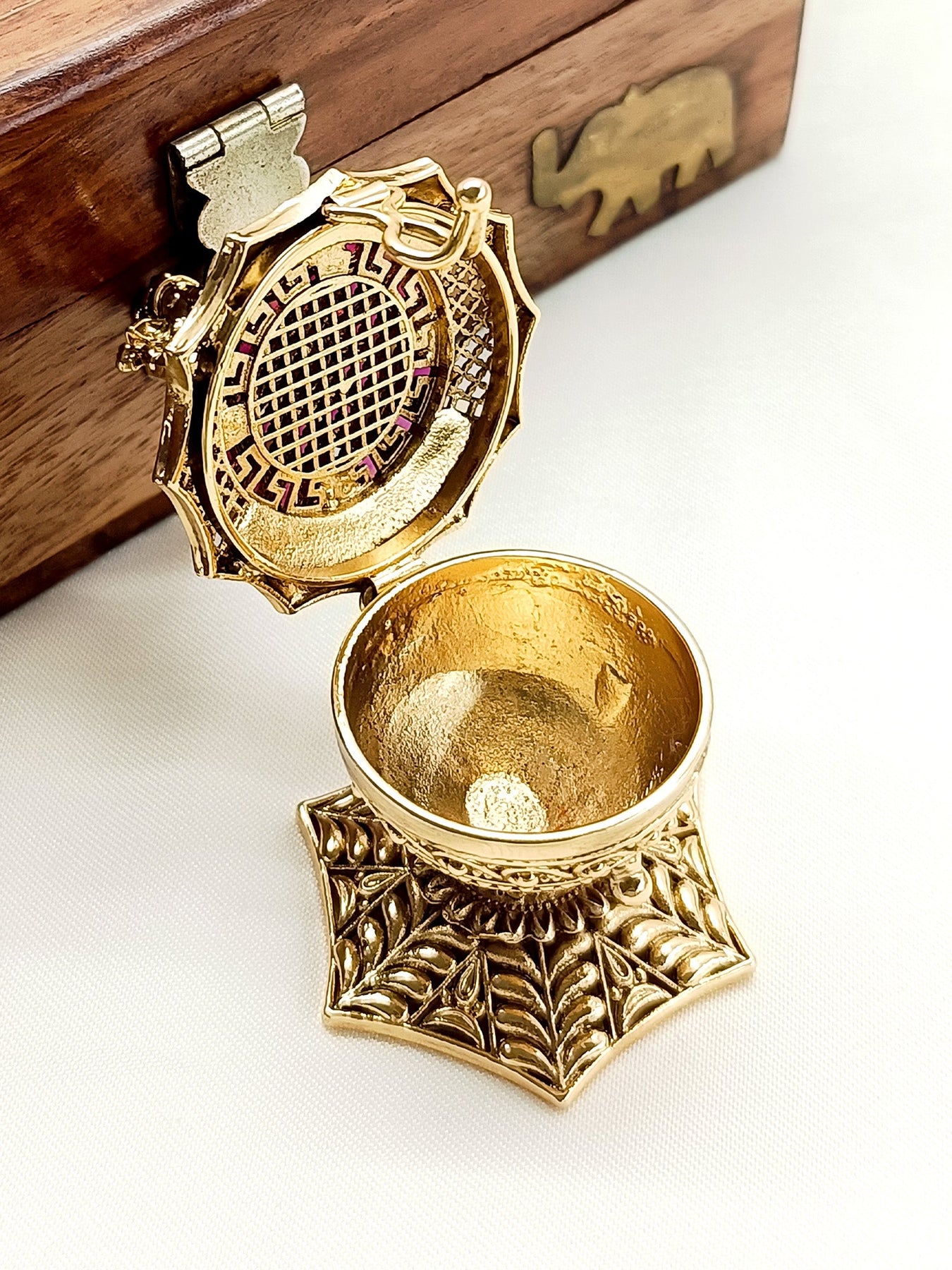 This Traditional Sindoor Dibbi Is Crafted From Gold Plated Brass Metal And Is Adorned With Intricate Temple Motifs. It Is A Must-have For Any Cultural Or Religious Occasion. Its Elegant Design Adds A Touch Of Sophistication To Any Outfit. Made With Expert Craftsmanship, It Is A Beautiful And Meaningful Piece To Add To Your Collection.