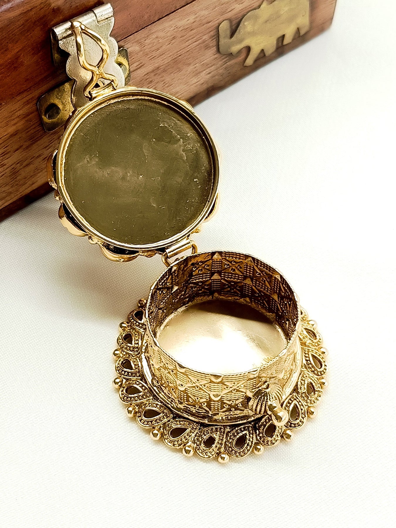 This Traditional Sindoor Dibbi Is Crafted From Gold Plated Brass Metal And Is Adorned With Intricate Temple Motifs. It Is A Must-have For Any Cultural Or Religious Occasion. Its Elegant Design Adds A Touch Of Sophistication To Any Outfit. Made With Expert Craftsmanship, It Is A Beautiful And Meaningful Piece To Add To Your Collection.
