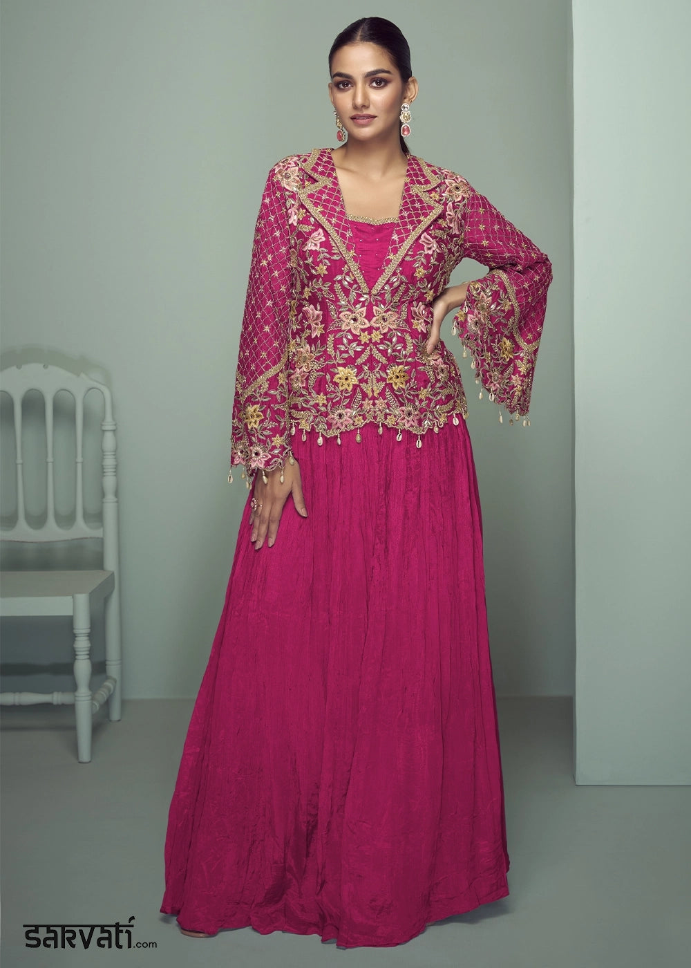 Magenta Pink Chinon Silk Jacket and Skirt Ensemble with Detailed Embroidery