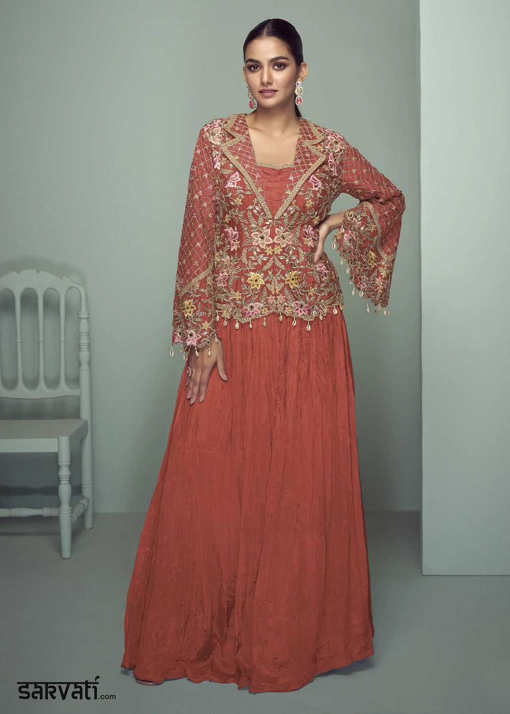 Rust Orange Chinon Silk Jacket and Skirt Ensemble with Detailed Embroidery