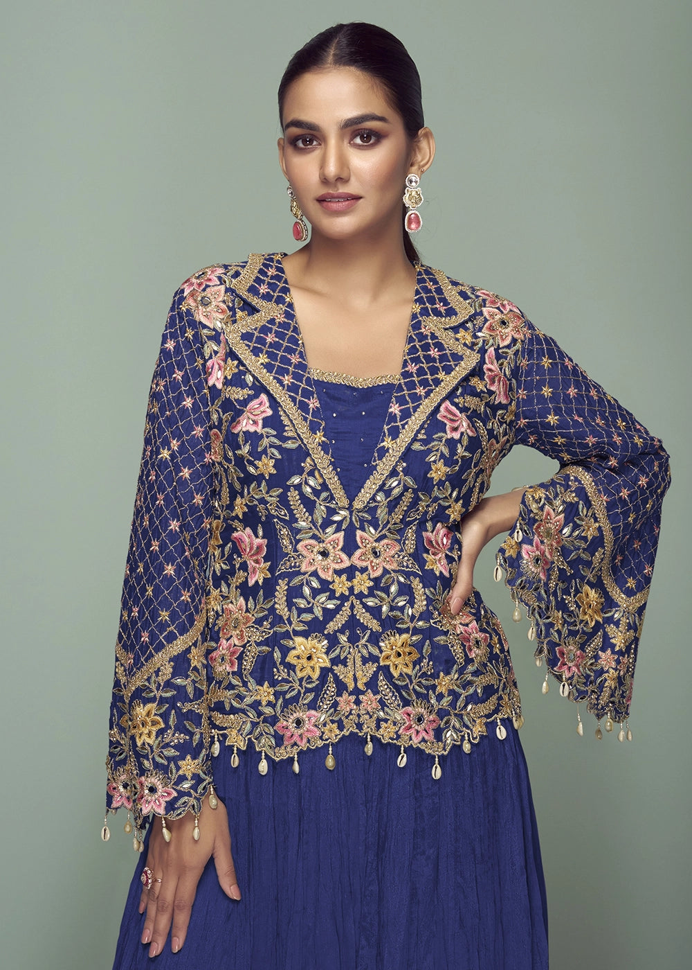 Berry Blue Chinon Silk Jacket and Skirt Ensemble with Detailed Embroidery