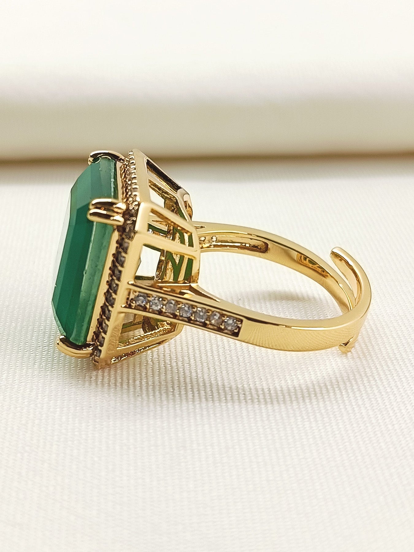 Elevate Your Everyday Elegance With This Exquisite Green American Diamond Finger Ring. Crafted From Premium Gold-plated Brass, This Piece Combines Durability With A Luxurious Finish That Resists Tarnishing. The Brilliant American Diamonds Catch Light Beautifully, While The Striking Emerald Stone Adds A Sophisticated Pop Of Color. Perfect For Those Who Appreciate Fine Jewelry Aesthetics Without Compromise, This Ring Offers Timeless Appeal And Versatile Styling For Any Occasion. An Investment In Quality Craftsmanship That Delivers Lasting Radiance.