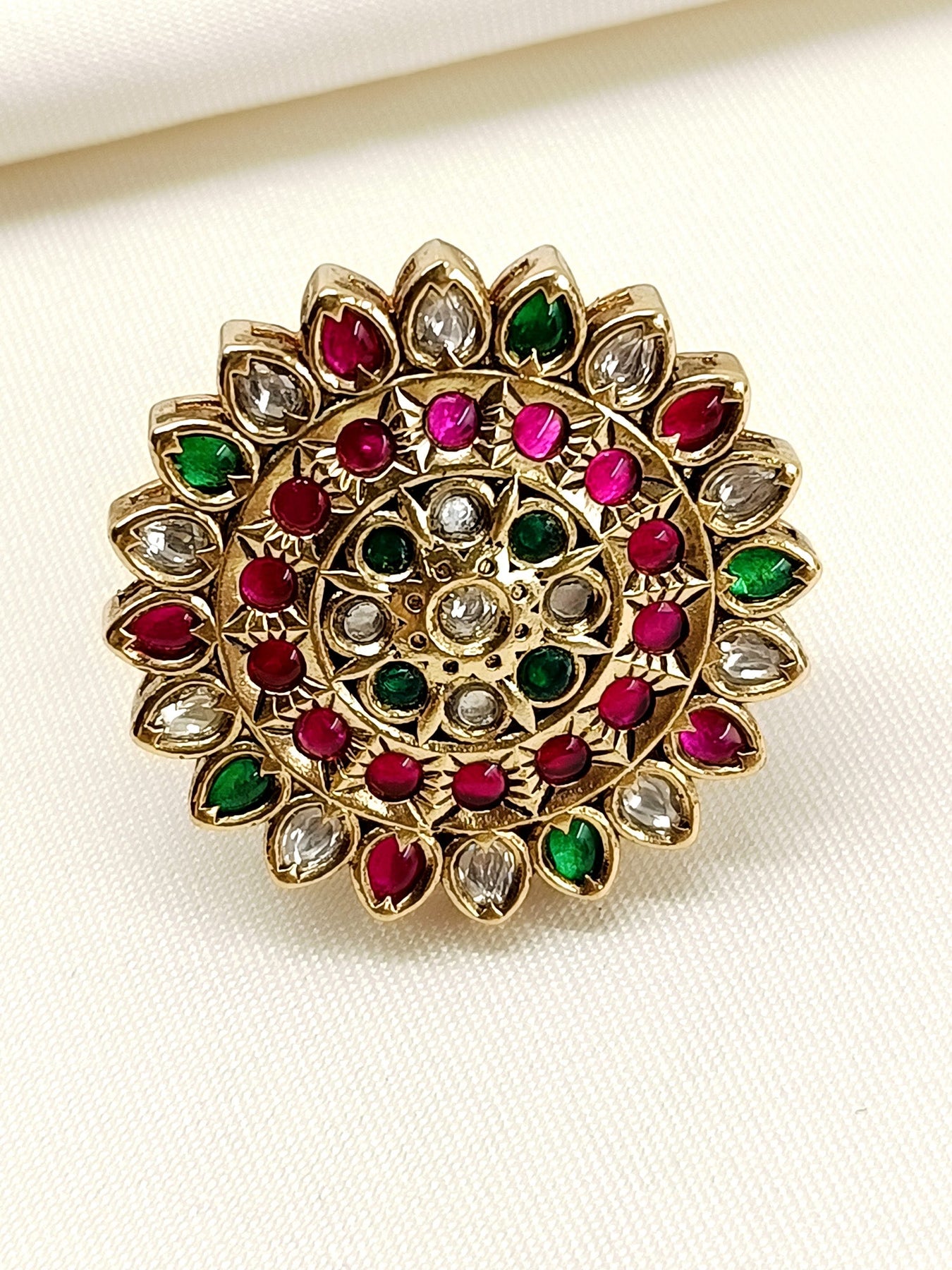 This Traditional R&G Kundan Finger Ring Features An Antique Gold-plated Finish, Showcasing Exquisite Craftsmanship. Adorned With Multi-colored Semi-precious Stones, It Offers A Timeless Elegance That Complements Both Classic And Contemporary Styles. Perfect For Those Who Appreciate Heritage Jewelry With A Refined Touch.