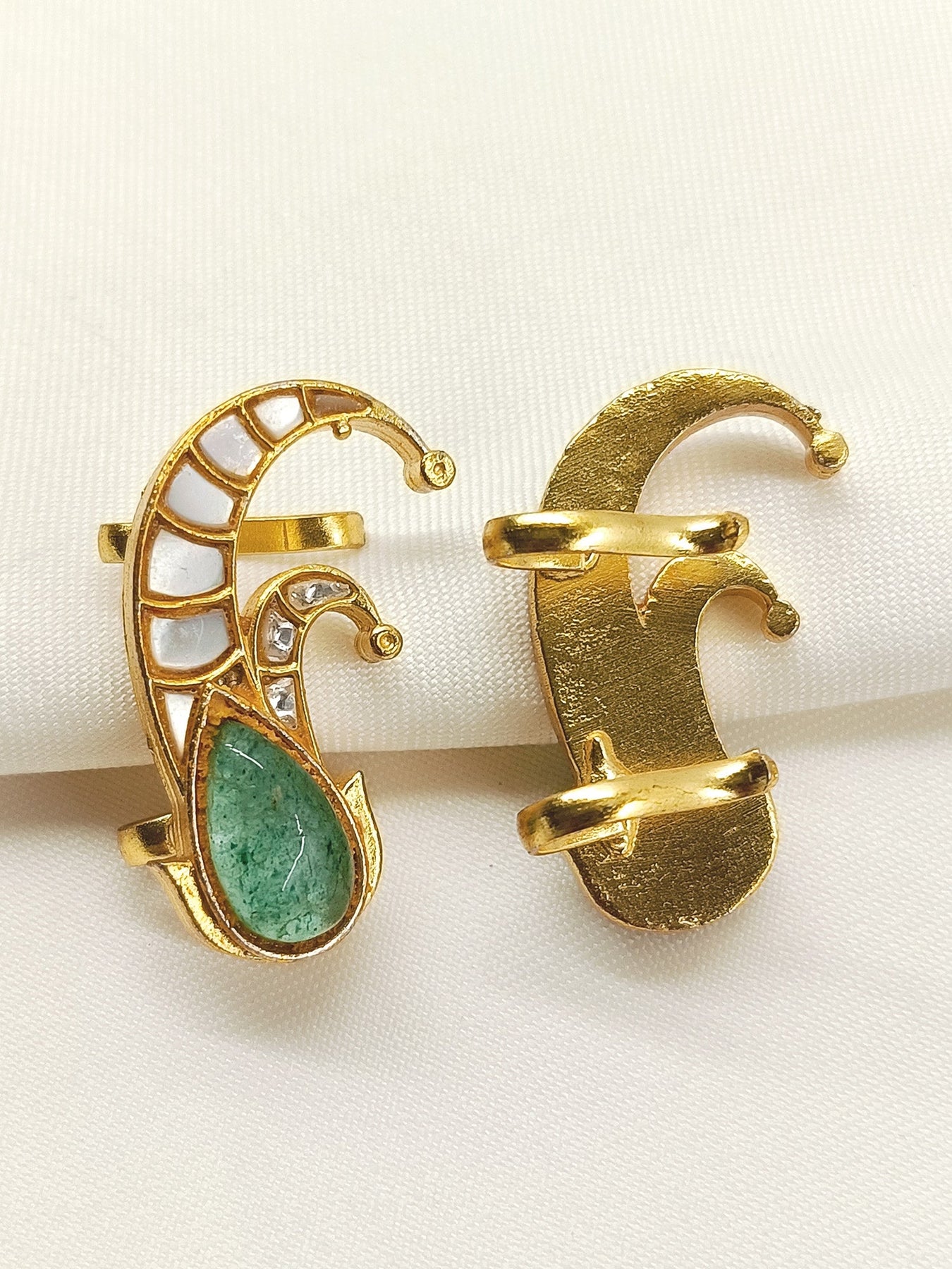 Elevate Your Style With The Green Gold Plated Kundan Ear Cuff, Crafted From Durable Brass Metal And Adorned With Authentic Kundan Stones And Delicate Beads. This Pair Offers A Sophisticated Fusion Of Traditional Artistry And Modern Design, Perfect For Adding An Elegant Touch To Any Outfit. The Gold Plating Ensures Lasting Shine, Making These Ear Cuffs A Versatile Accessory For Special Occasions Or Everyday Wear.