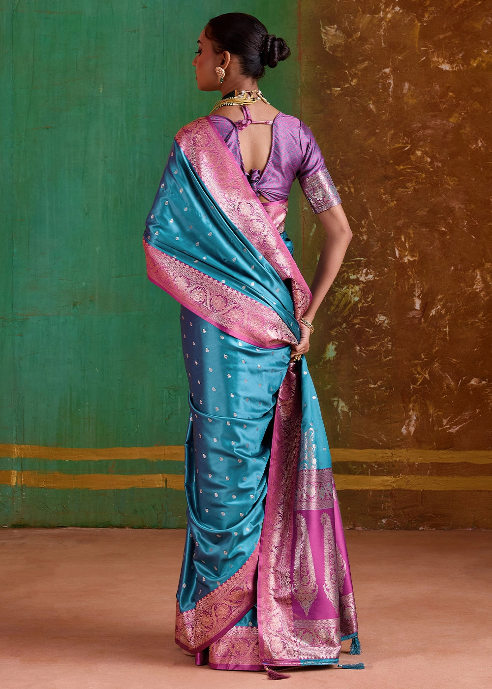 Cerulean Blue Satin Silk Saree with Intricate Zari Weaving and Contrast Pallu