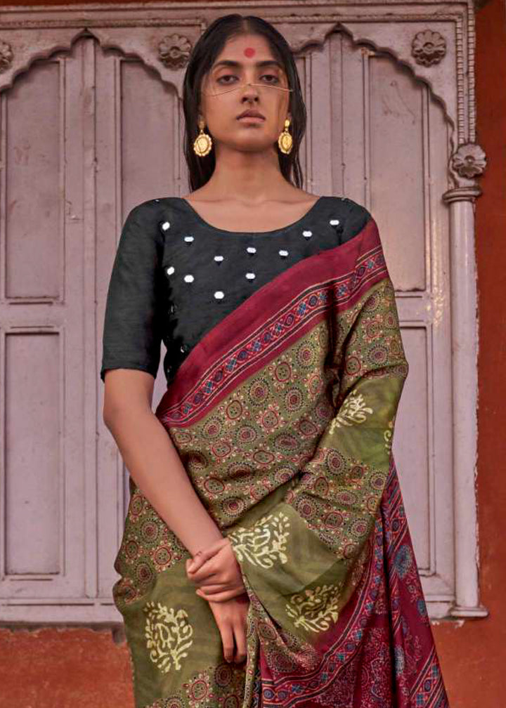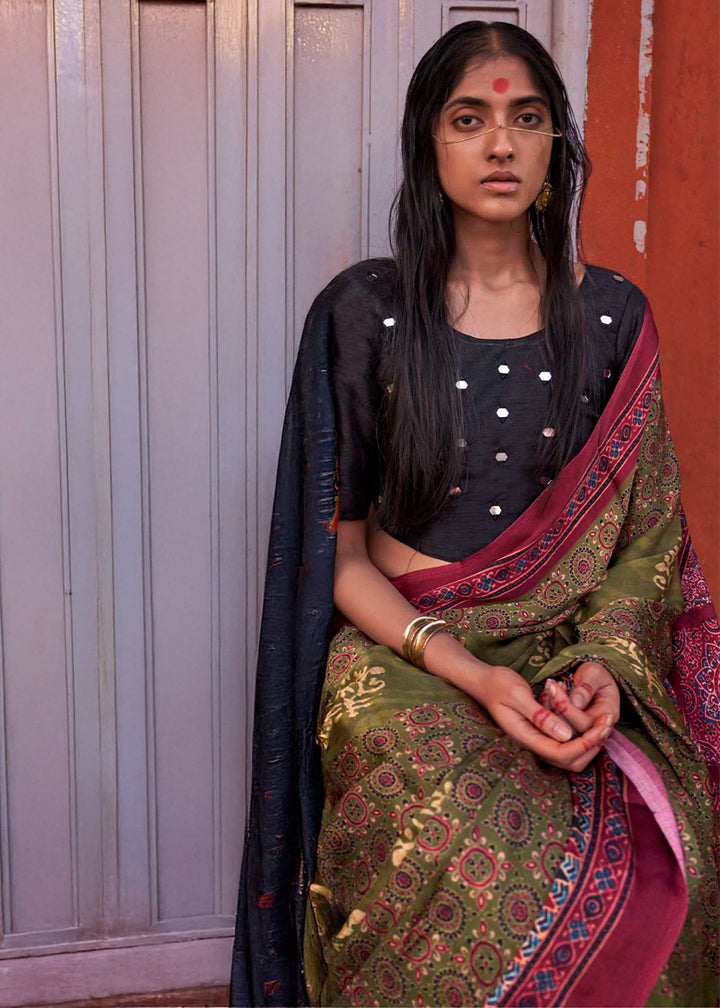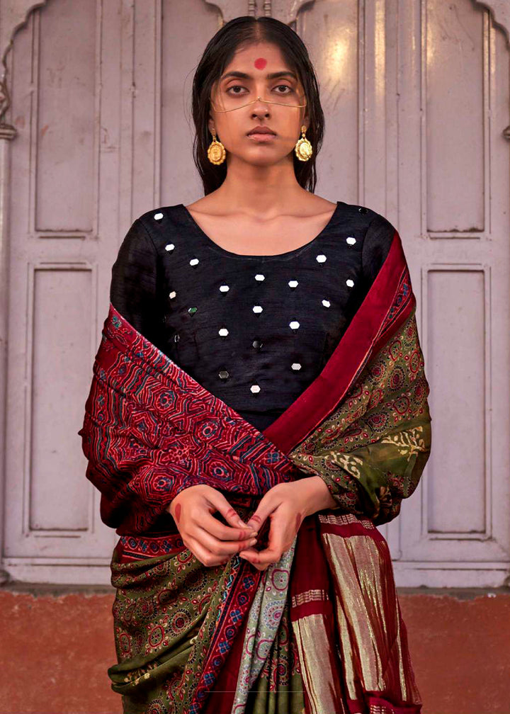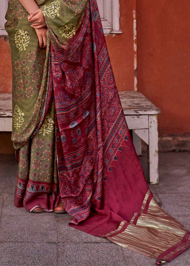 Green & Pink Viscose Silk Saree with Ajrakh Print and Gajji Lagdi Pallu