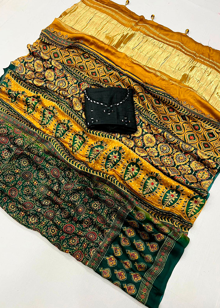 Green & Yellow Viscose Silk Saree with Ajrakh Print and Gajji Lagdi Pallu
