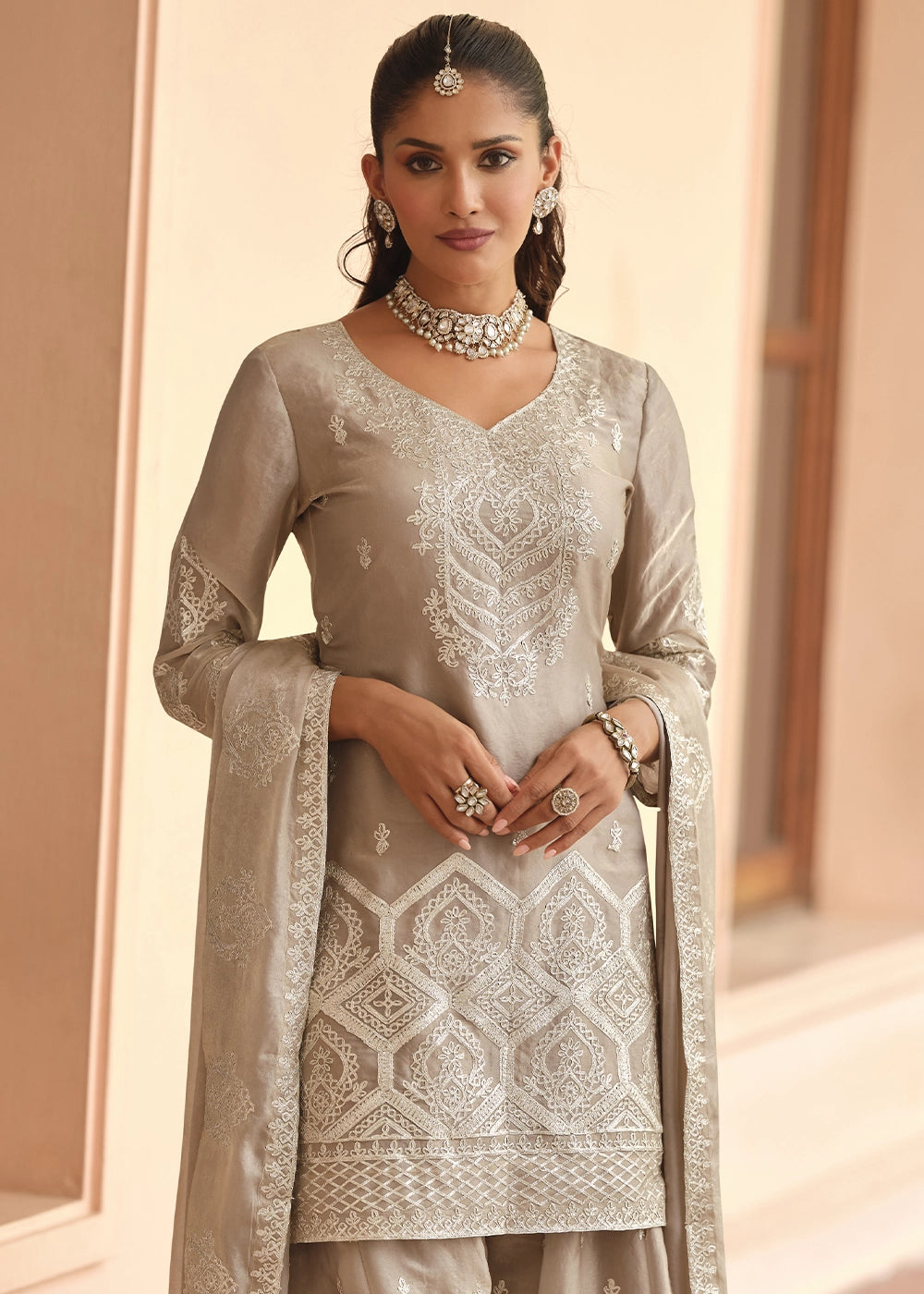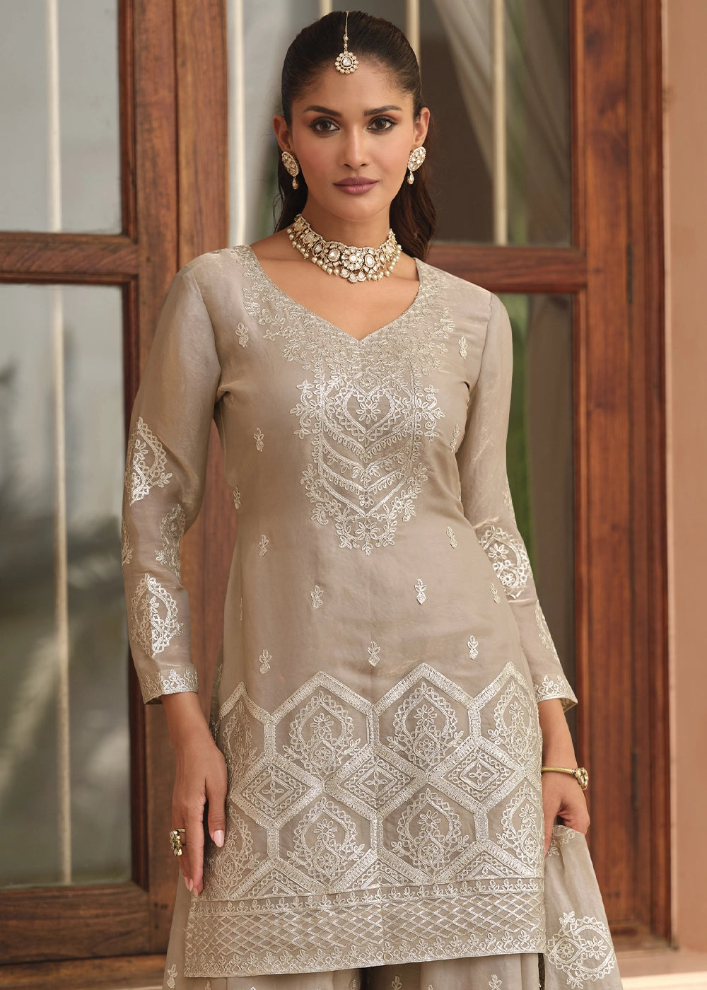Greyish Brown Silk Palazzo Suit with Fine Embroidered Detailing
