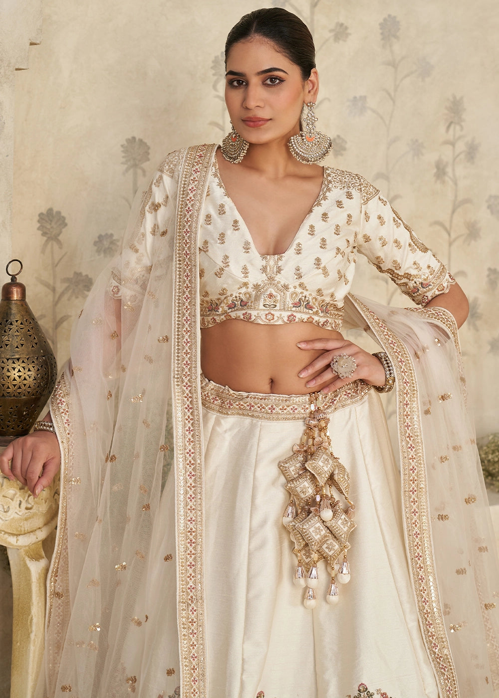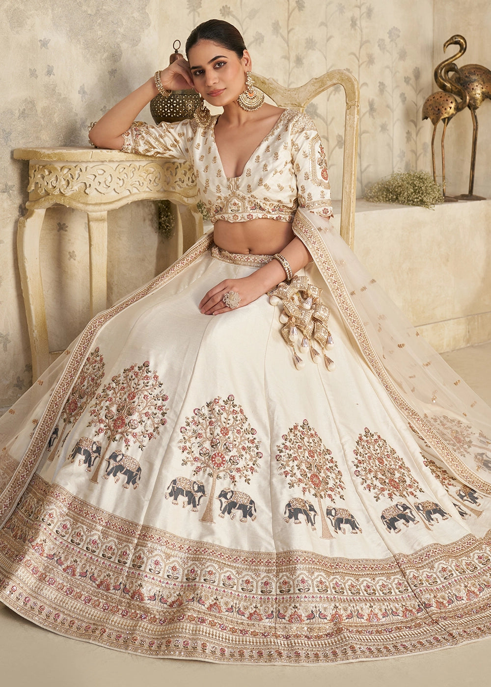 Ivory White Silk Lehenga Choli with Elephant Motifs & Zari Embroidery