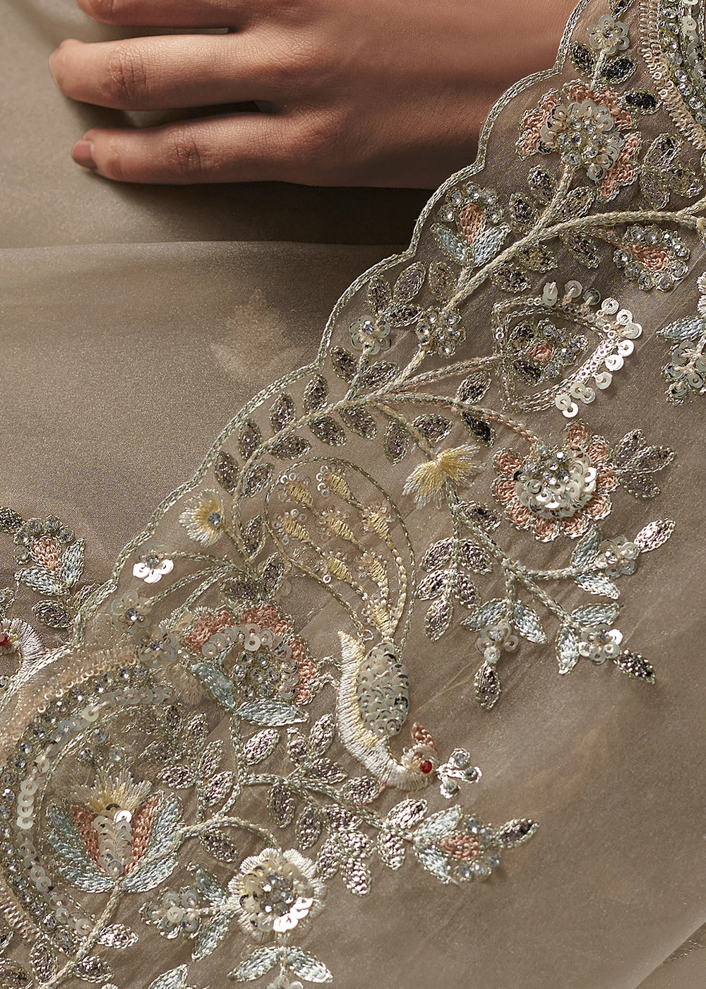 Light Brown Designer Tissue Saree with Elegant Sequin & Stone Detailing