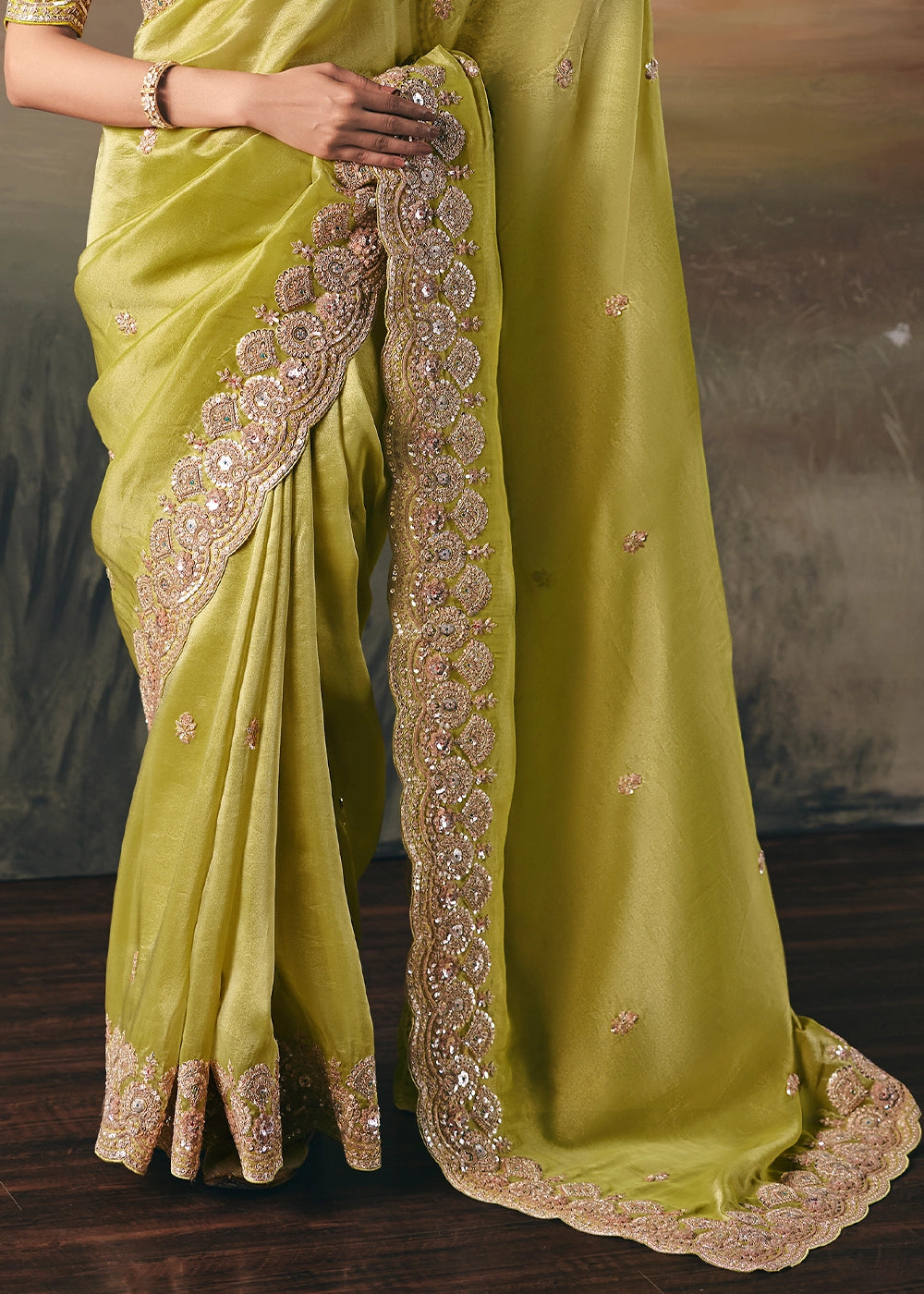 Limerick Green Designer Tissue Saree with Multi-Handcrafted Work