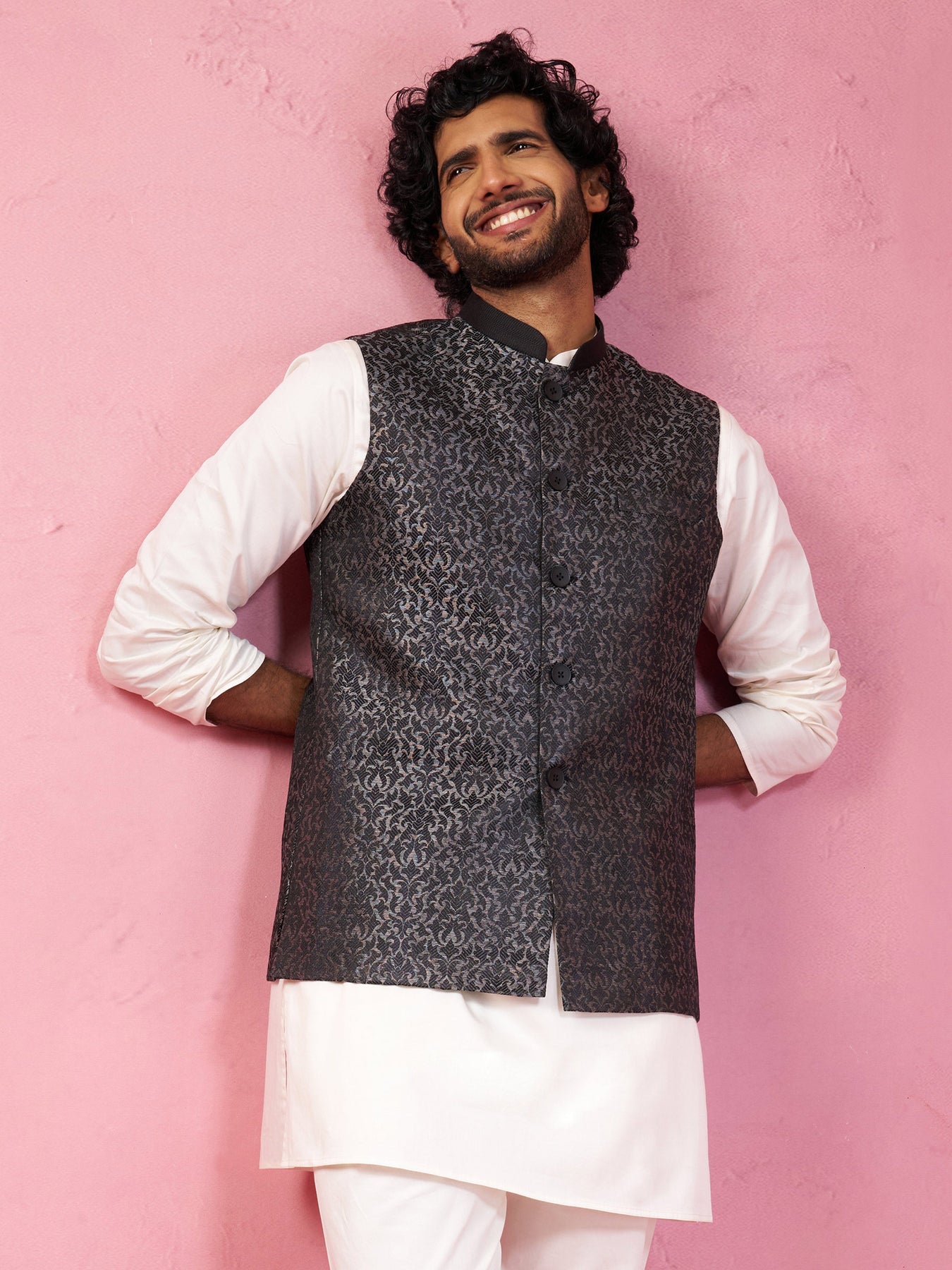 Enhance your ethnic wardrobe with Sarvati grey imported suiting Nehru jacket featuring refined jacquard patterns with ethnic motifs and decorative thread embroidery on collar.