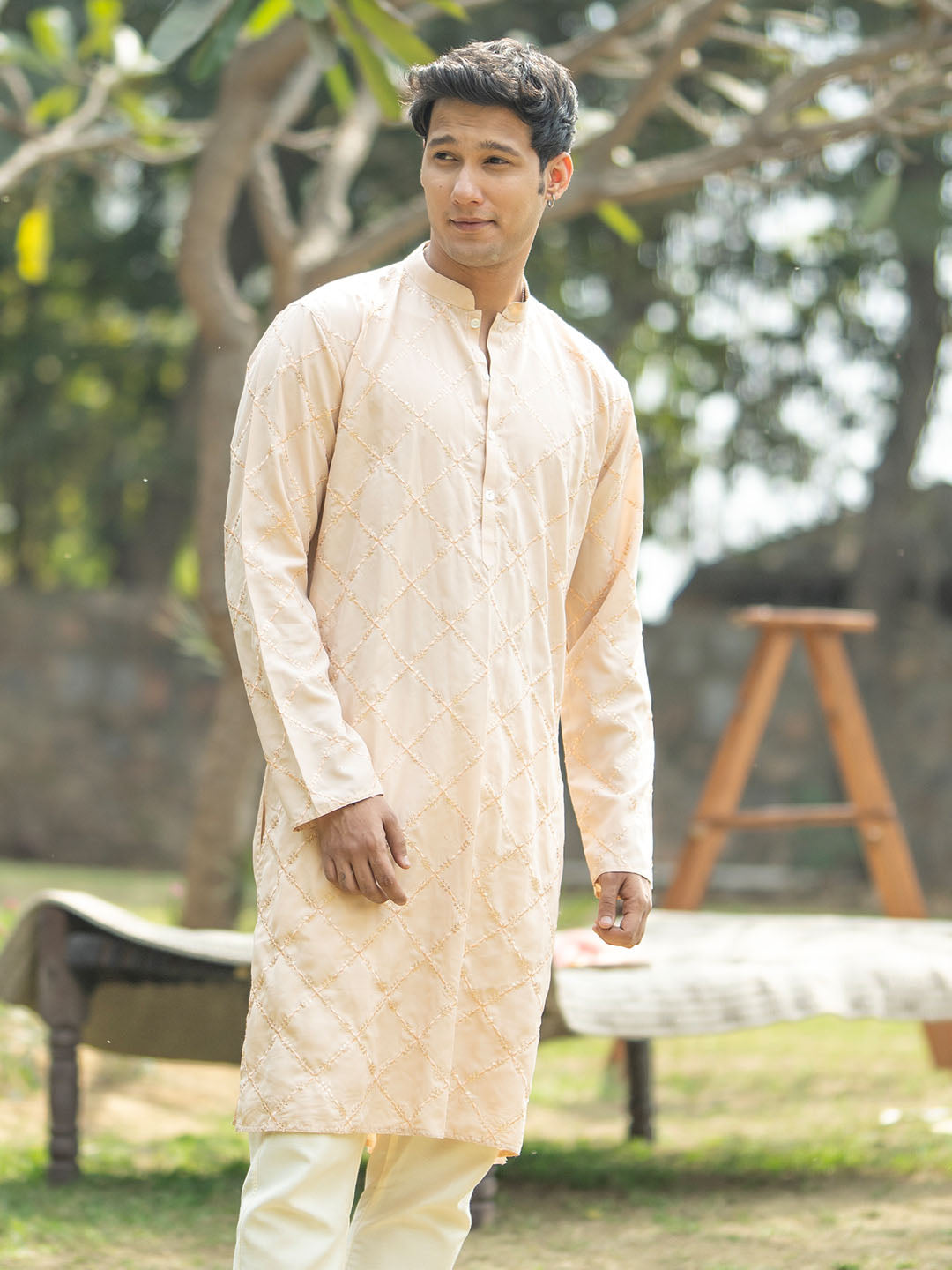 Sport this classic kurta set from Sarvati this season. Dress this piece up with your favorite accessories and head out to any family event in style.