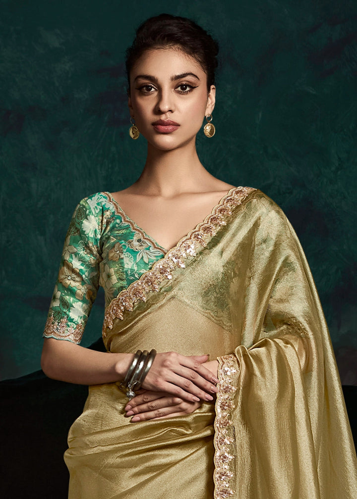 Moss Green Tissue Saree with Dhaga,Thread & Sequin Embellishments - House of Sarvati LLC