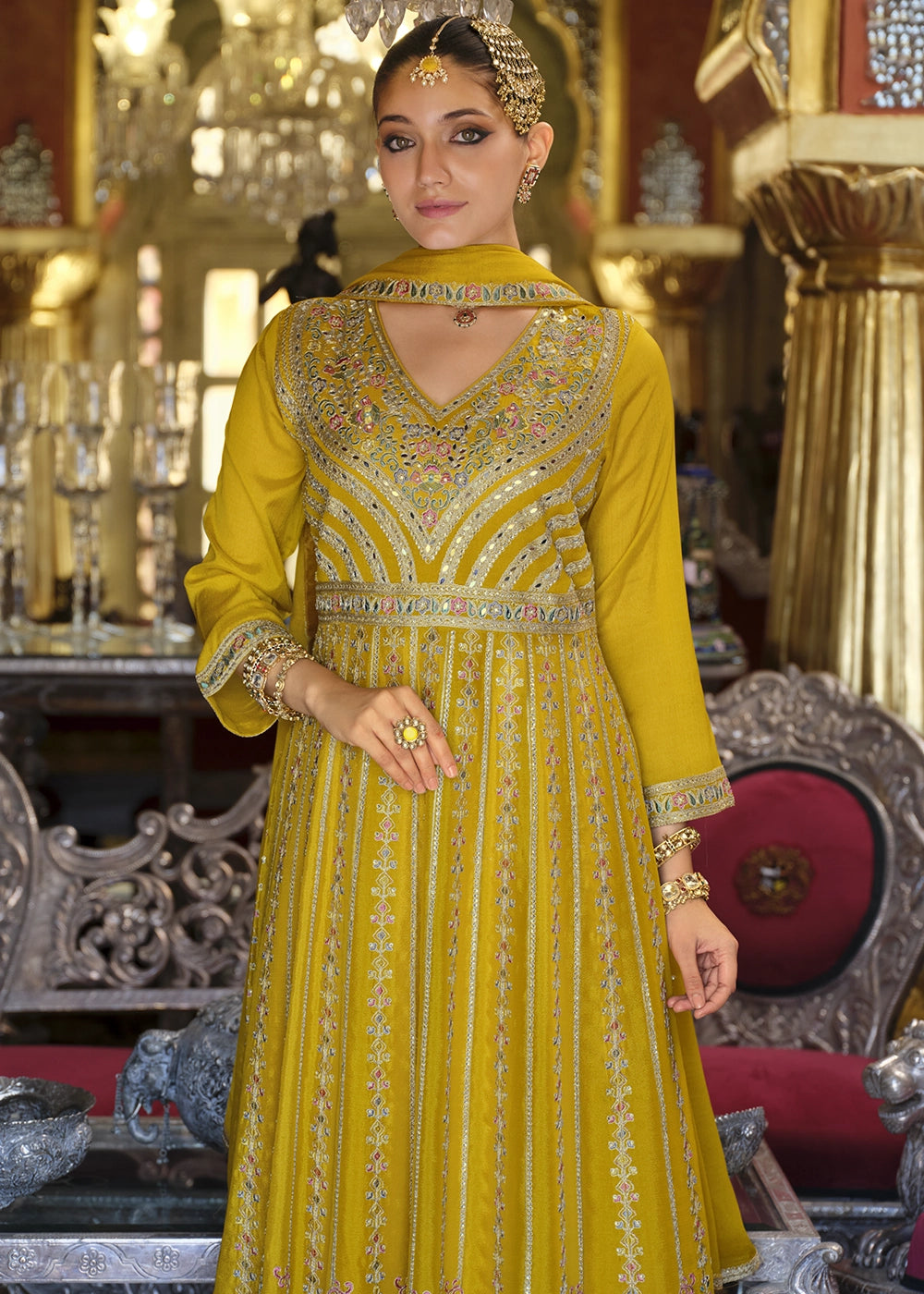 Mustard Yellow Embroidered Chinon Silk Anarkali with Palazzo Set