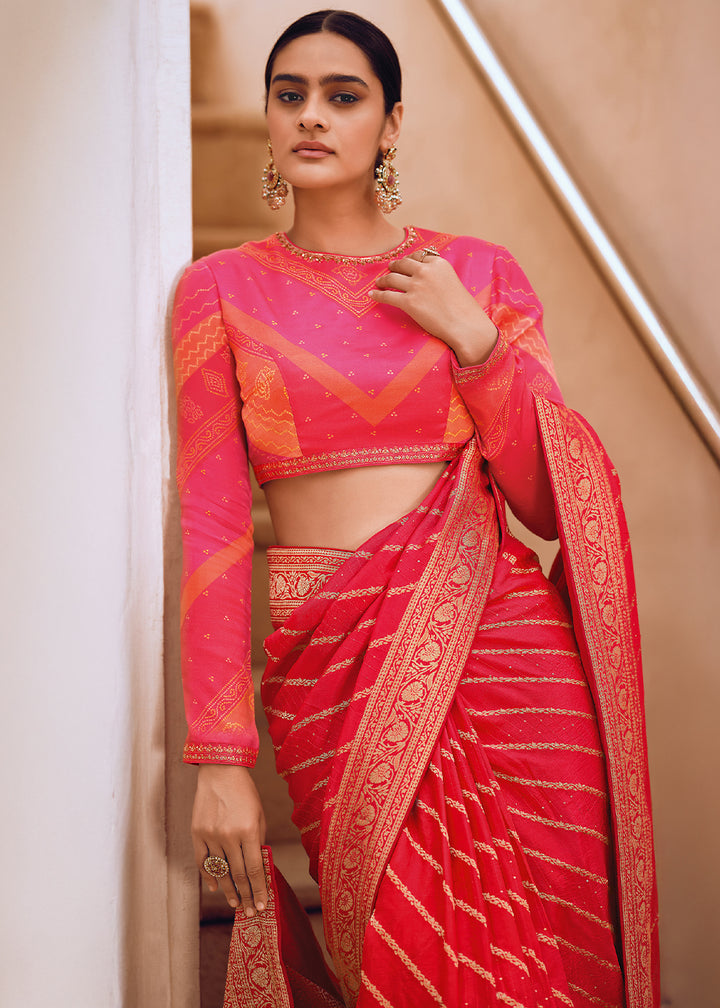 Reddish Pink Leheriya Designer Saree in Woven Viscose Silk