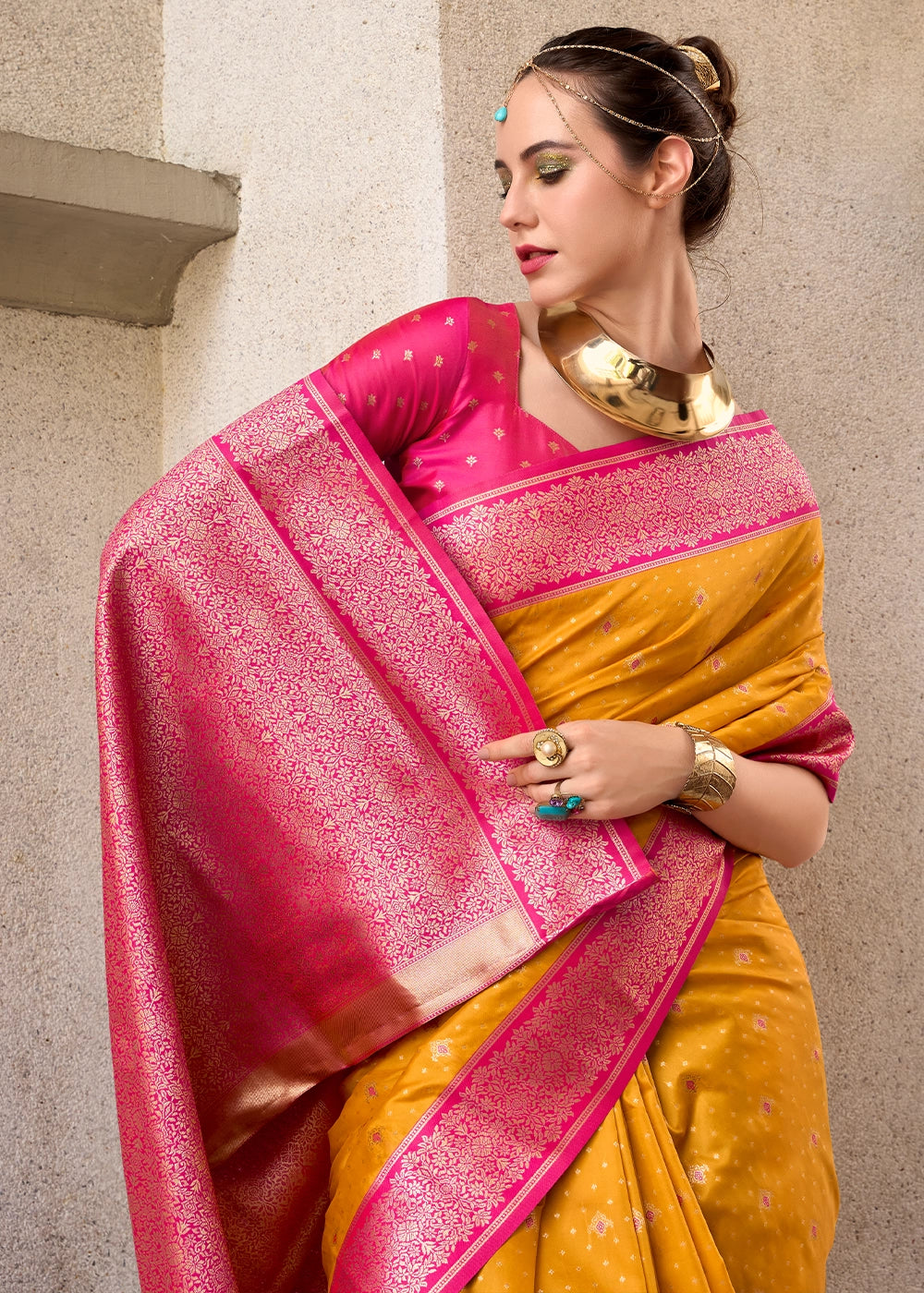 Saffron Yellow Zari Woven Soft Silk Saree with Contrast Border